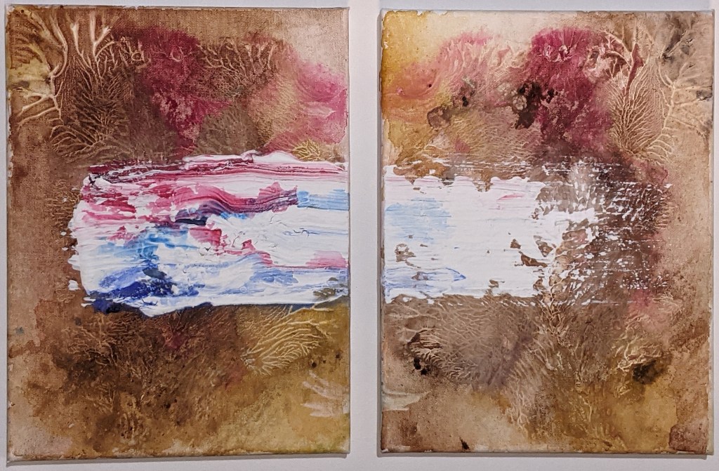 “The More You Look, The More You See” by Thomas Typewriter (watercolor & gesso on stretched canvas, two 16″ x 20″ panels)