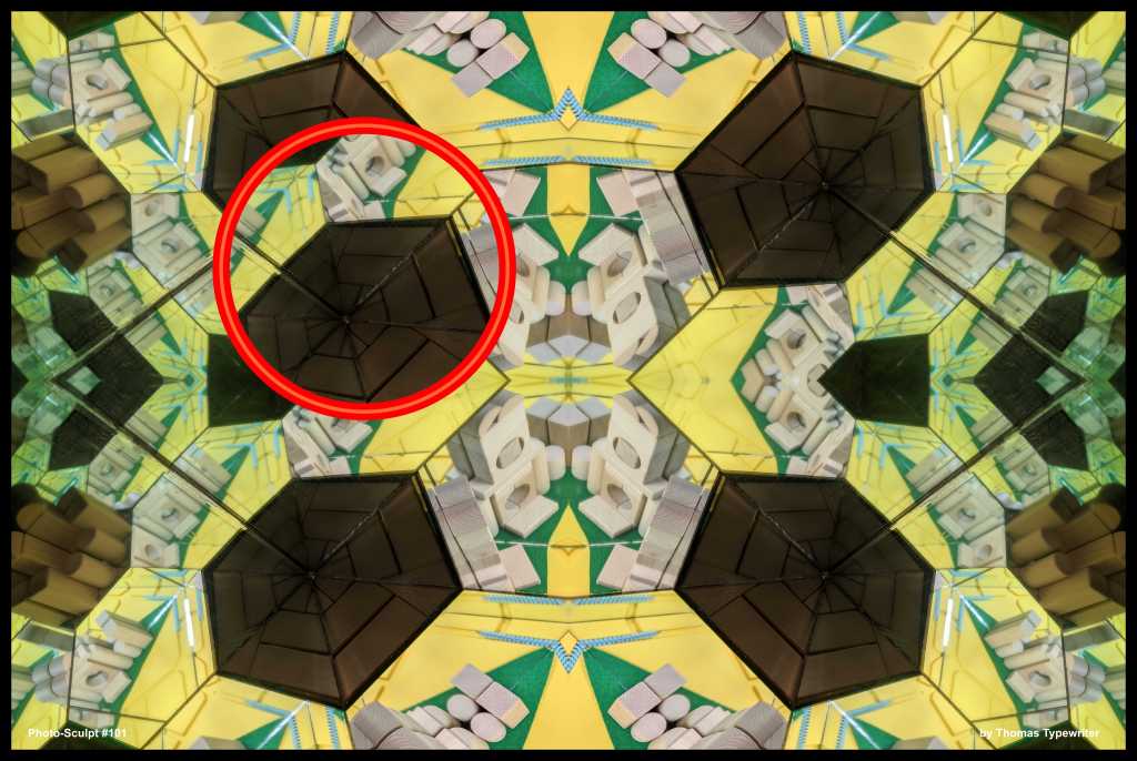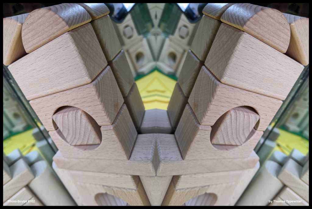 “Photo-sculpt #101” by Thomas Typewriter (22″h x 33″w. photographic-sculpture: wooden blocks, felt, brushes, plastic lids arraigned with and within mirrors then digitally composited with text and vector graphics)