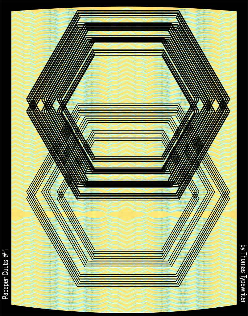 “Papaper Cuuts #001” by Thomas Typewriter (22″w x 28″h, mixed-media: colored paper + digital composition)