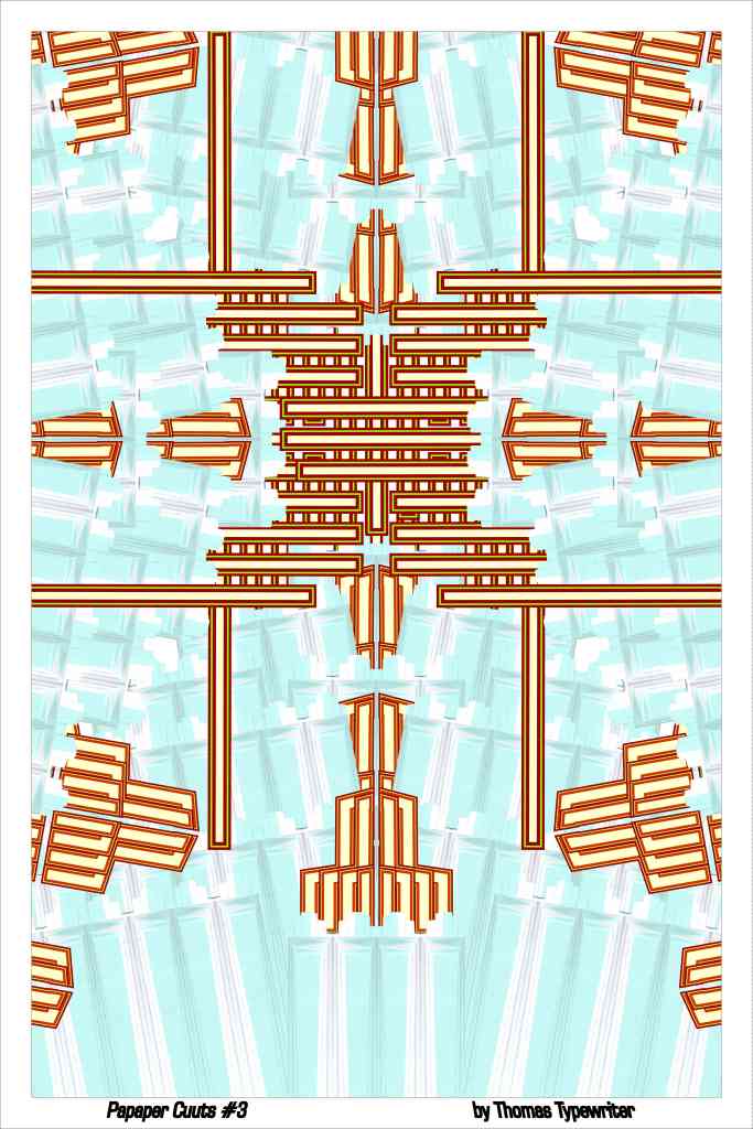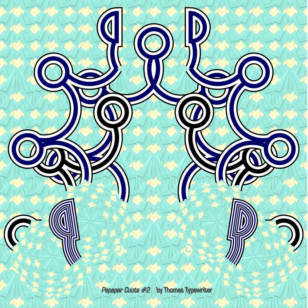 “Papaer Cuuts#6” by Thomas Typewriter (mixed media, 36″w x 24″h, printer paper, colored paper & ink folded then digitally composited with vector graphics)
