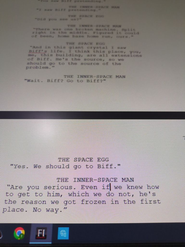 A long desk runs across the stage while a drawing desk sits behind the long desk. On the long desk is a computer monitor, small desktop, keyboard, mouse, a scanner, a bin, and a large stack of papers. THOMAS TYPEWRITER sits at the desk moving pages from the stack of papers to the scanner. Thomas leans over grabbing the top page from a stack of papers to the side of the computer. He opens the scanner lid and places the paper inside. After closing the lid, he fiddles with the computer. The HUM AND WHIR of the scanner activating goes out. Thomas opens the scanner lid when it finishes. He removes the sheet of paper and places it in a bin to the opposite side of the desk. Behind him sits OPHIDIA OPERAHOUSE at the second desk. It is an animator’s desk with full light table. Various pencils and squares and drawing guides sit on top of the desk. To her side is a shelf of pull-out bins. Various papers and extra drawing materials fill the bins. Ophidia focuses on her drawing, leaning over to finish a drawing while Thomas scans. As he scans his third piece of paper, Ophidia stretches in her chair. She gets up and walks behind Thomas, tenderly placing her hands on his shoulders. He reaches up one hand, the one not using the computer mouse, and places it on top of her hand.