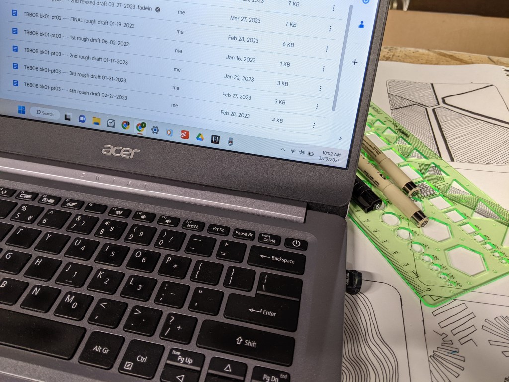 March 29, 2023 Thomas Typewriter Tagged art, bit by bit, designs, every bit, in progress, laptop, paper, pens, putting in the time, studio, Thomas Typewriter, work in progress, writing Leave a comment
