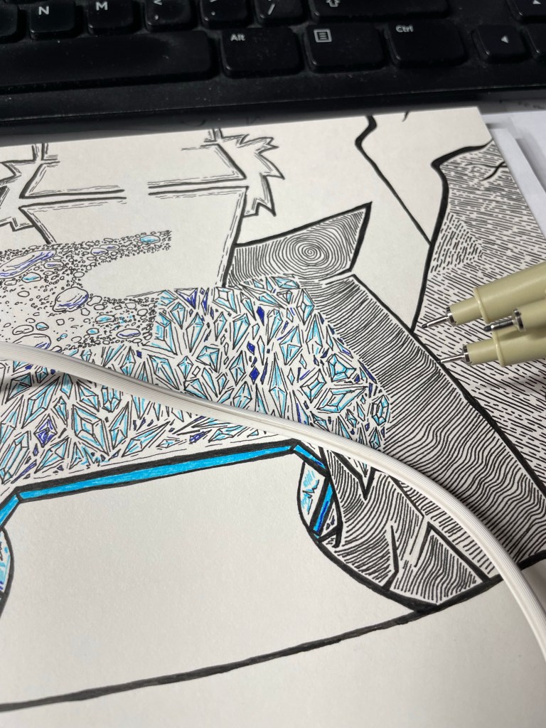 A brown wood paneled room almost square in shape, the TV Den is just off the main entryway and stairwell. The room contains bookcases, a television, a sofa and an entryway. A soft thick pile rug covers the floor. A large tube television in a wooden cabinet is on the wall opposite the large sofa covered in knitted throws in mixes of brightly colored pastels and deep earth tones . A knitted doily hangs over the edges of the side of the TV. A short glass coffee table sits on the rug between the sofa and TV. The end table next to the sofa currently has a bulbous table lamp and a stack of drink coasters made from slices of stone. Their swirling colors match well with the mix of colors on the throws. A long rectangular window sits above the sofa. In the bookcase, besides many movie cassettes with names like “The Fish Wife”, “The Four Saints”, “Crime Town”, “At the Caves of the Little Sister” and “The Bridge Builder” along with some of Biffard’s drawings Additionally mixed in the other shelves are various books, family photos, sports awards from Biffard’s younger brother and academic awards from Biffard’s older sister. Biffard the Rabbit and Rockchester the Pet Rock run into the frame from the main entryway to the TV Den. They turn on the tv and sit down close to the screen. A LOUD POP AND HUM rings as a bright dot of light dances across the center of the screen. The light expands and quivers till the whole of the screen is filled with the end of the opening sequence from “The Babysitter Tales”. It is a title card with an empty space in the center with illustrations of Gloomarella the Doom Witch, Rod Pocalypse the Doom Baby and Smiles Goodson. In the center appears the text “Episode 1”