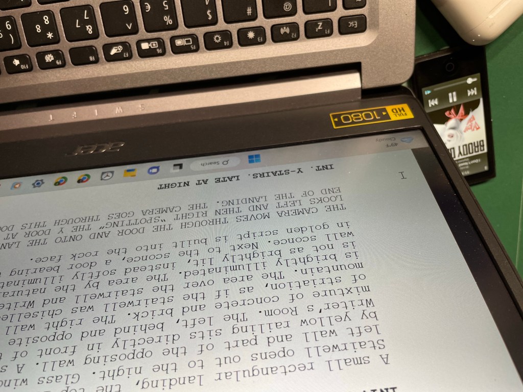 A long desk spreads across the stage. It has a monitor, keyboard, mouse and scanner on the desk. A stack of papers sits next to the scanner. Behind the long desk is a drawing table with an animator’s light-box at an angle to the desk. The long desk has a simple office chair while the drawing desk has a padded high stool. A doorway sits to the stage-left side of the desk. THOMAS TYPEWRITER sits at the desk scanning pages. OPHIDIA OPERAHOUSE sits at the desk behind him, drawing animation cells.