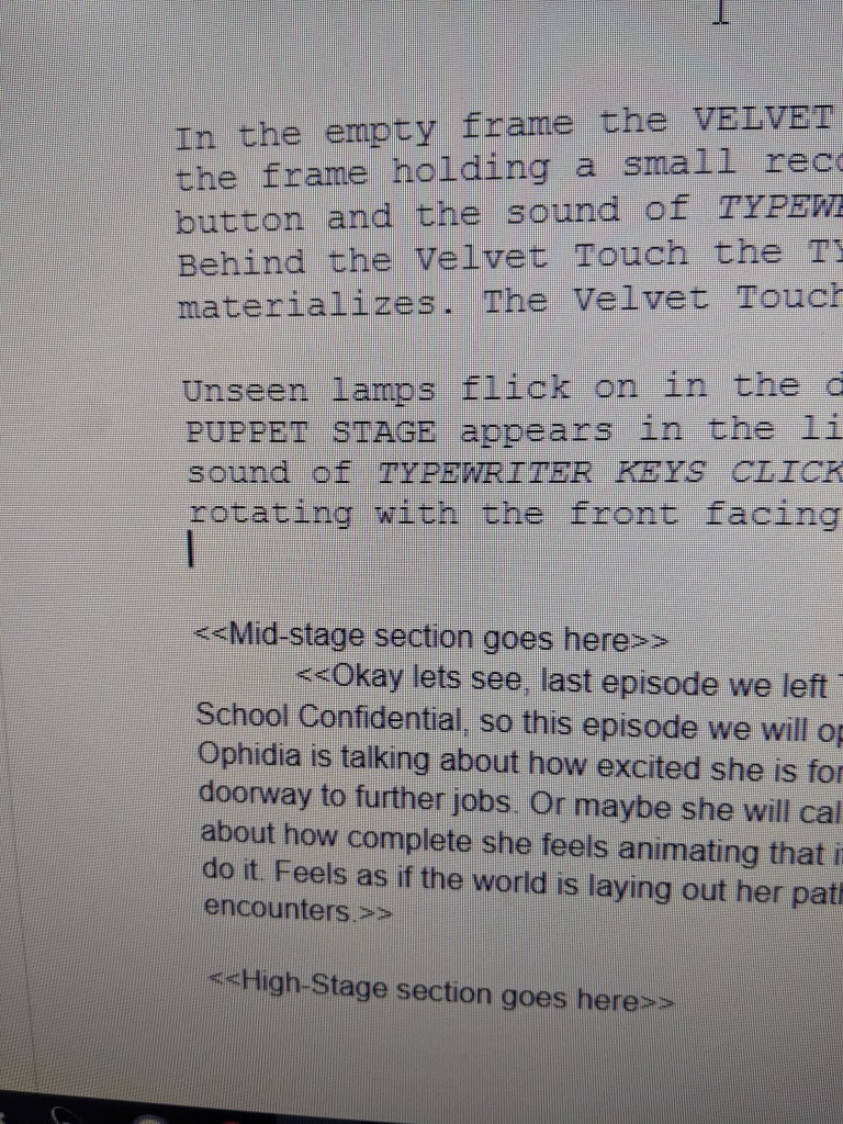 The curtains of the Mid-stage area of the TYPEWRITER ABSTRACT PUPPET STAGE fill the screen. They are currently closed but soon they part. The stage lights turn on with the sound of A LIGHTSWITCH CLICKING ON revealing…