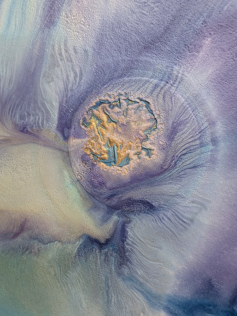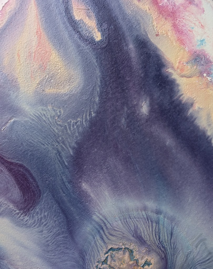 “Eruptions” by Thomas Typewriter (16″x20″, acrylic paint and watercolor on stretched canvas)